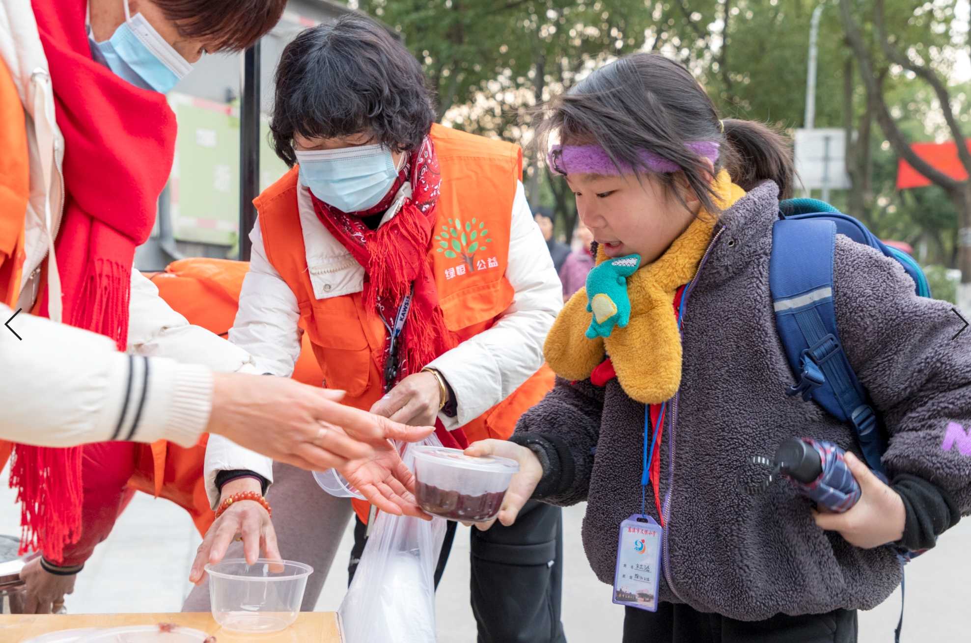 大爷大妈们见到志愿者的第一句话就是“你们又来送粥啦!”小学生们也在早餐之余,享受着这一碗热腾腾的腊八粥。